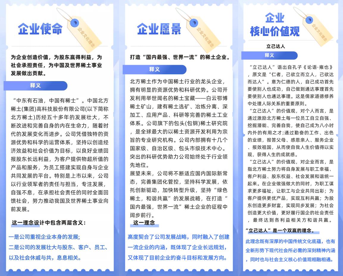 包钢(集团)公司在5 月份开展了第七次“企业文化宣传活动月”。华体会手机站·官方版在线公司以此次“企业文化宣传活动月”为契机,通过微信公众号开展北方稀土企业文化理念宣传活动,旨在进一步加强企业文化建设,持续弘扬包钢精神,提高职工归属感,加深职工对企业文化的了解,推动公司企业文化落地,不断增强企业核心竞争力!